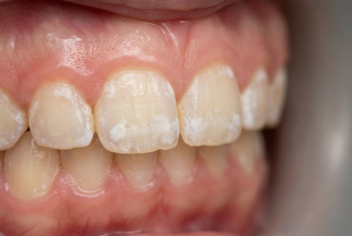 Primul semn vizibil îl reprezintă petele albe, cretoase sau opace pe suprafața dinților, care arată pierderea mineralelor și porozitatea smalțului.
