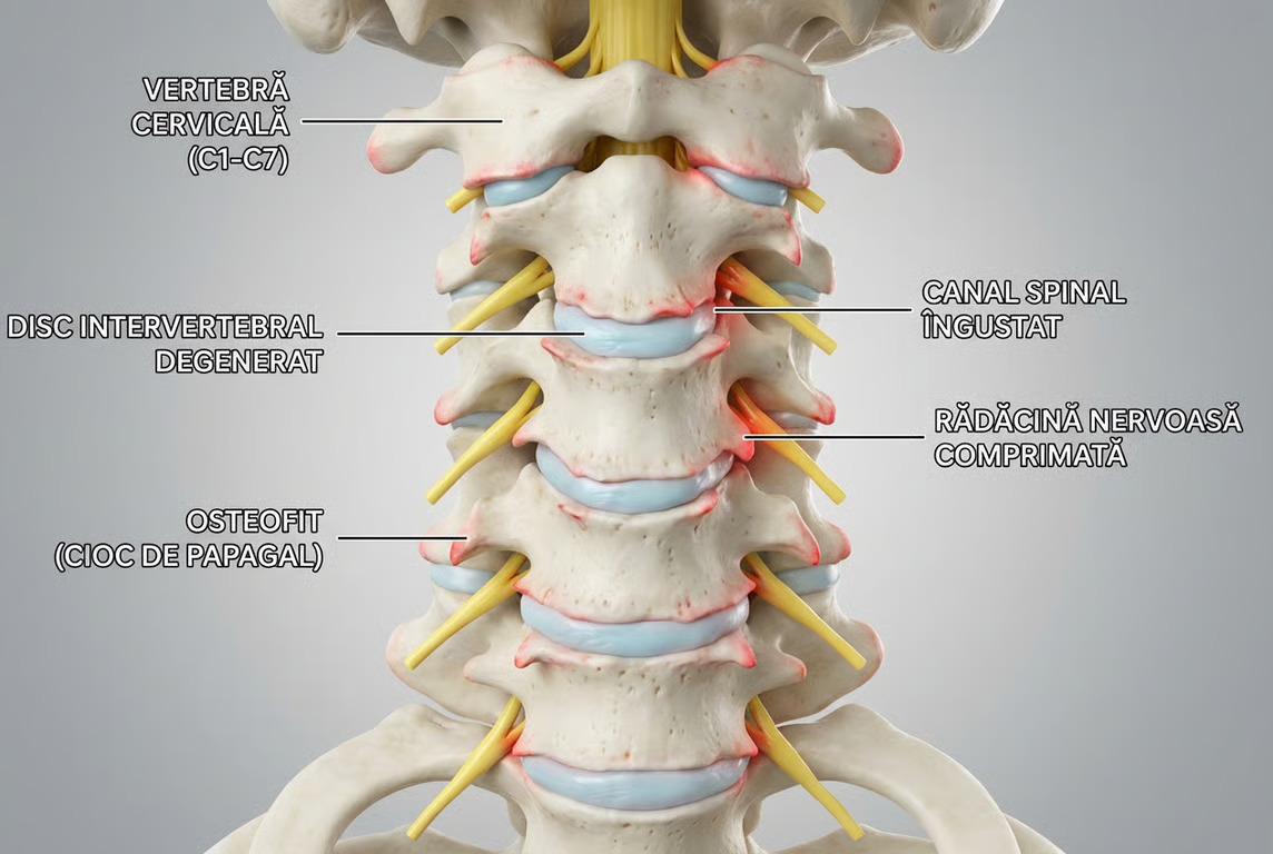 Spondiloza cervicală este o afecțiune degenerativă frecventă, mai ales după 50 de ani, rezultată din uzura structurilor gâtului. Înțelegerea mecanismelor bolii și a opțiunilor terapeutice este esențială pentru a-i controla simptomele și a menține o viață activă. Află ce este spondiloza cervicală, care sunt simptomele specifice, cauzele, factorii de risc și cele mai eficiente metode de tratament și prevenire, pentru a putea lua decizii informate și a reduce efectele negative ale acestei afecțiuni asupra calității vieții.