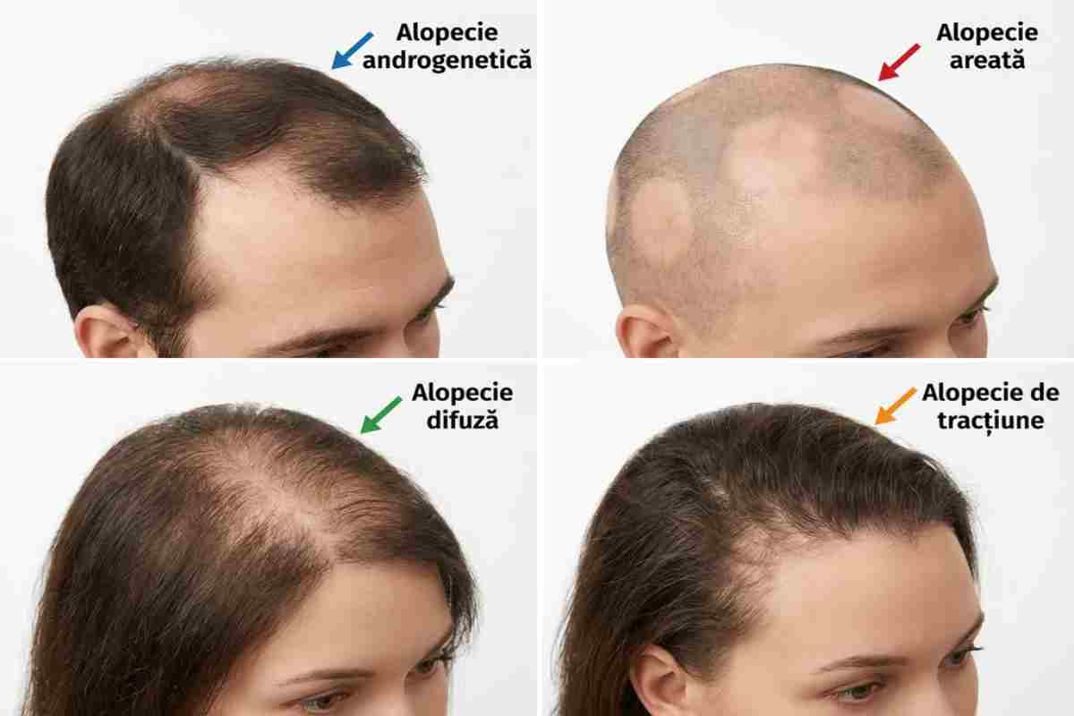 Alopecia androgenetică: Aceasta este cea mai frecventă formă de cădere a părului, apărând atât la bărbați (aproximativ 50% până la 50 de ani), cât și la femei după menopauză. La bărbați, tiparul clasic include retragerea liniei frontale și subțierea în creștet, în timp ce la femei rărirea este difuză pe partea superioară a scalpului, cu linia frontală păstrată. Principala cauză este sensibilitatea genetică a foliculilor la androgeni, în special la dihidrotestosteron (DHT), care determină miniaturizarea progresivă a firelor de păr.